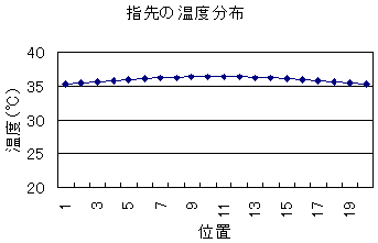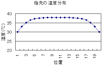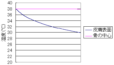 指先の断面の温度分布 (中心が骨、左右端が皮膚表面)