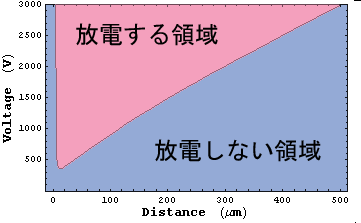 さて、体に静電気が貯まったからと言って、すぐに私の指先から稲妻が飛びまくるわけでは決してない。そこには、「ある程度以上の静電気が貯まらないと稲妻が発生しませんよ」という法則がある。それが、パッシェンの法則と呼ばれる法則である。例えば、パッシェンの法則による標準的な空気中での「放電する領域」と「放電しない領域」を示してみよう。