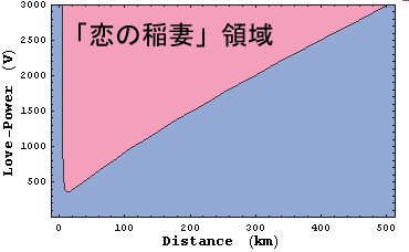 男女の距離が5kmより小さくなるととたんに「恋の稲妻」に必要なラブパワーが大きくなっていることが判るだろうか?男女の距離があまりに近いと、何故か「恋の稲妻」はなかなか飛ばないのである。「恋」に落ちるためには少し距離が必要なのか、それとも、「恋」には落ちるけれども近すぎるせいで人目を気にして「恋の稲妻」を飛ばすことができないのか…色々理由は考えられるだろうが、とりあえず「恋のパッションの法則」は距離が小さすぎると「恋の稲妻」に必要なラブパワーが大きくなる、と言うのである。