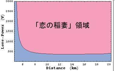 試しにこの「恋のパッションの法則」による「恋の稲妻」とそうでない領域の一例を次に示してみよう。(実はこの「恋のパッションの法則」は縦軸・横軸(すなわち、距離とパッション=Love-Power)共に任意単位なのであるが、ここでは適当にkmとVという単位で示してみた。)