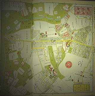 |  目黒白金図 (1858)による、目黒不動の部分。内部の位置関係はそれほど変わっていなかった。内部に入ると龍泉寺という名前が納得できるだろう。 また、「虚無への供物」が好きな方ならば、いきなりコンガラ童子達が出現するのには驚くはずだ。  1858年といってもたかだか150年前である。江戸時代の圧倒的な長さから比べたらごく最近である。  | ![]()  |