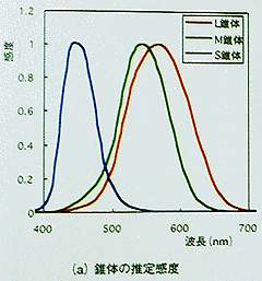 それでは、明るい部屋で感じる色はどうなっているだろうか。色を感じる錐体の中には波長感度の異なる3種類の視物質がある。それぞれの波長感度を以下に示す。