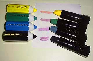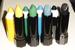 さて、口紅の色が変わる様子をよ〜く見ていると、2種類の材料が個別に発色しているように見える。どうも文才の様子が違うようで、それが判るのだ。結局、一番下の黄色の口紅の場合で言うと、次の表に示すようになっているようである。確かに、こういう複数の色材の組み合わせの方が楽だし安全なのだろう。