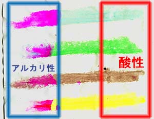 すると、見事なまでに色が変わる。アルカリ性溶液ドメストをかけた部分はマゼンダ色に変化し、酸性溶液サンポールを振りかけたところは青、緑、黒、黄色のままである。何もかけないところの色も青、緑、黒、黄色であるところを見ると、この白い紙は酸性紙なのだろう。口紅を紙に塗る時に、紙によって発色が違うのも酸性紙か中性紙かとかそういうことで違いがでるのなら、それはとても自然である。