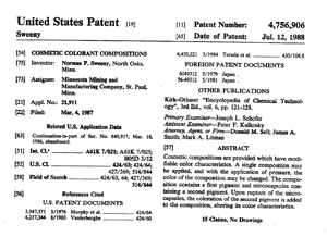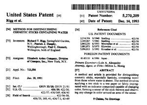 参考までに「色が変わる口紅」の特許も調べてみた。下に示すのが二つのUSP(UnitedStates Patent = アメリカ合衆国の特許)である。上に示してあるのが「pHで色の変わる化粧品」で、下に示したのが「カプセル式の色材を使って、塗るときに色が変わる化粧品」である。さっきの雑談の中で出てきた「この口紅の成分は実はカプセル状のものになっていて、塗りつけられるときの圧力でそのカプセルが壊れて中から出てくるもので色が変わるんじゃないの。」というのもあながち嘘八百ではなかったようである。