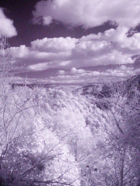 というわけで、上の写真が散歩の途中で撮った写真です。左が可視光で眺めた景色で、右が赤外線で眺めた景色です。赤外線で眺めると、上空の青空は暗くなり、暗い空に雲が輝いています。また、その一方地上では、葉緑素(クロロフィル)は赤外線を強く反射するので、木々の葉は眩しく輝いています。まるで、白い綿菓子をまとっているかのようです。