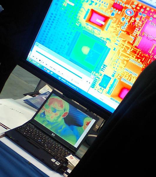 サーモカメラが映し出す人の顔を眺めていると、メガネをかけた人たちがみなサングラスをかけているように見えることに気がつかされました。サーモカメラが温度推定に用いる遠赤外線をプラスチックやガラスはほとんど透過させないので、サーモカメラでメガネをかけた人の顔を撮影すると、メガネの部部分がサングラスさながらに暗く映るのです。だから、メガネをかけた人をサーモカメラで写すと、みなサングラスをかけているように見えます。