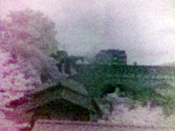 というわけで、iPhone 4 のフロントカメラに可視光カット・赤外線通過フィルタを取り付け・撮影してみたのが右の写真です。あいにくの曇り空だったので、ちょっとパッとしない写真になってしまいましたが、樹木の葉が白く輝く赤外写真独特の世界が映っています。