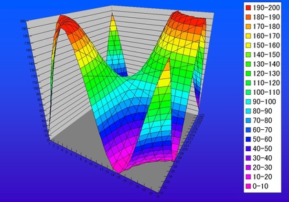 エクセルで「2次元のコンター図(密度図)」を描こうとするならば、グラフを使って配色指定に苦労するよりも、セル自体を「条件付き書式」で色づかせる方が楽であるように思います。「条件付き書式」というのは、セルの値に応じてセル配色(など)を変化させる機能です。それはたとえば、「最小値はこんな色、真ん中辺りの値はこんな色、そして最大値はこんな色」というようにして配色などを指定できる機能です。