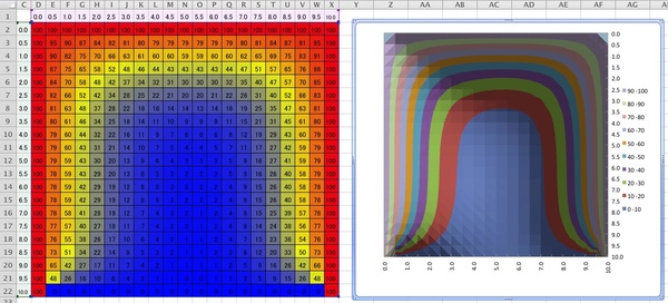 下の図は Excel Mac2011で非定常2次元熱伝導計算をするセルを「条件付き書式」で色づけたもの(左側)とそのセルをコンター図にしてみたもの(右側)です。どちらがわかりやすいか…は言うまでもないでしょう。