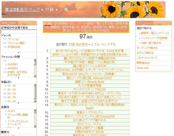 「雑誌DE流行マップ Lite」をメンテナンスしました。Javascriptコントローラが度データ遅延・動的読み込み・各種表示を行う「雑誌DE流行マップ Pro」のような解析機能は持っていませんが、「あぁ、こんなものが流行っているんだなぁ。こんな付録に惹かれる時代なんだな、そして、こんな人が流行っているんだな」と、時折時代の流れを眺めてみるには良いかもしれません。