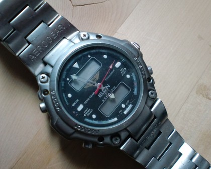 腕時計を手に取りつけようとすると、針が止まっていることに気づきました。夜の間に、電池が切れてしまったようです。(ちなみに右の腕時計は、反転・逆さ印字タイプと言う風変わりなものです。ですから、写真が一瞬変に見えるかもしれませんが、これで正常なのです)