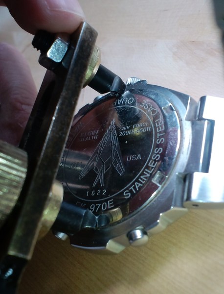 そこで、電池交換工具セットに入っているネジ式用工具を使い、裏蓋を開けてみました。ダイソーで税込420円ナリで売っているネジ式用工具は、右の写真のように、2つの時計の窪みを押さえる金具部分を合う位置に固定した後に、裏蓋の(反対側同士の)窪みに押し当てながらグルグルと回していく・・・というように使います。窪みに合うサイズにきちんと金具を固定してやれば、時計の簡単に裏蓋がグルッと回り、裏を開けることが容易にできるのです。