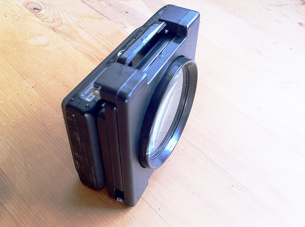 「(折り畳みルーペの関節構造の理由から)デジカメ前面のレンズ前部に、ルーペ・ファインダーが折り畳まれる」という具合にして、折り畳みルーペをコンパクトデジカメに取り付けてみると、サイズを計ったかのようにピッタリジャストサイズにはまります。折りたためば薄型コンパクト、撮影・再生時にはルーペファインダーを広げると少し古道具風の雰囲気に満ちた小道具に早変わりします。使用時には背面に廻る巨大丸レンズが、折りたたみ時には360°移動して前面で存在感を主張するという素晴らしいデザインになっています。