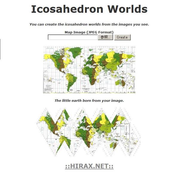 "Icosahedron Worlds" は、好きな画像ファイルから、のりしろなども付いた正二十面体の展開図を作成するWEBサービスです。あなたの手元にある画像ファイルを、ブラウザ画面からアップロードするだけで、自動的にサーバー内で画像変換が行われて、ブラウザ画面に正二十面体の展開図が表示されます。表示された正二十面体の展開図を印刷すれば、あなたの画像ファイルを実際の正二十面体として組み立てることもできます。