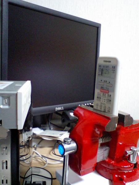思いついたらやってみよう!というわけで、ソフトウェアを仕立て、万力でエアコンのリモコンを固定して、hirax.netが稼働しているサーバのCDドライブを外に引っ張り出し、実際に検証してみた結果が下に貼り付けた動画です。ケータイで撮影した動画ではわかりづらいかもしれませんが、CDトレイの角でリモコンのボタンがきちんと押されて、エアコンがピピッと鳴り、そしてエアコンからの送風が始まりました。