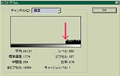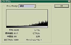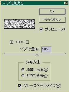 両方とも、「ノイズの量」を55にしてある。左上の「均等に分布」の画像を見ると200から255までの間にノイズが-均等に分布-していることがわかる。ということは255 から ( 255-「ノイズの量」 ) までのレベルにノイズが-均等に-分布していることがわかる。ただし、「ノイズの量」の最大値は999であるから、さらに、何らかの処理が加えられているのだろう。