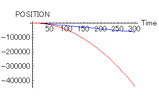 理想的な場合(赤)に比べて、抵抗のある場合(青)の落ち具合が鈍っているのがわかると思う。それでは、もっと時間が経った場合はどうだろうか?それを次に示す。エレベーターが落ち始めて300秒後までの軌跡である。つまり、五分間もこのエレベーターは落ち続けているのである。落ちた距離は理想的な場合で40kmの深さに達している。すごいエレベーターである。こんなに落ち続けていると、すでに重力加速度が一定とは言っていられなくなる。