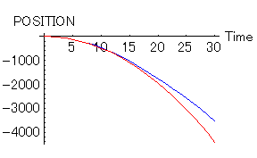 その計算の結果を以下に示す。これが落ちていくエレベーターの軌跡である。抵抗のない場合が(赤)で抵抗のある場合が(青)である。エレベーターが落ち始めてから30秒後までの軌跡である。
