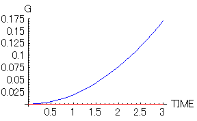 理想的な場合(赤)はずっとゼロすなわち無重力状態であるが、抵抗のある場合(青)は無重力状態は最初だけで、50秒後位には通常の状態に戻ってしまっている。最初の部分をもう少し拡大してみる。次に示すのは、3秒後までの落ちていくエレベーターの中の人に働く重力加速度(と実際の加速度の差分)である。