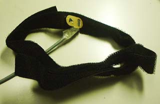一応、電極部はこんなベルト固定式にしてあるので「誰でも簡単に使える」ようになっている。しかし、このベルトで体に電極を張り付けた状態というのはかなりサイバー(よく言えば)であり、他のもっと正直な言い方で言うとかなりアブナイ状態である。これを付けていると、それだけで受けが取れるのではないかと思えるほどだ。