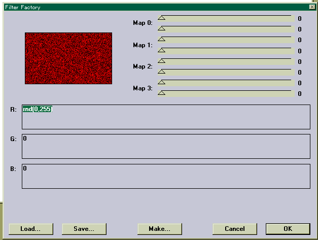 ![]()  |  たった、これだけである。 Redに乱数を与え、Green,Blueのチャンネルには0を与える。  |