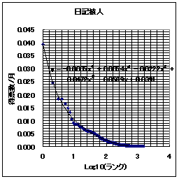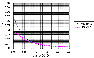 ところで、日記猿人では上位サイト(すなわち、横軸で0に近いところ)での関係式の傾きがReadMe!JAPANよりも小さい。すなわち、上位サイトの得票数が拮抗している。これは一体何故だろうか?