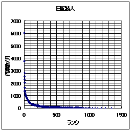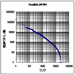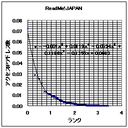 R eadMe!JAPANでも日記猿人でも横軸が2以上(すなわち100位以下)の場所などでは、ほとんどポイントはゼロみたいなものである。すなわち、100位より下のWEBのアクセス(本WEBへのアクセスも含めて)は誤差みたいなものなのだ。何しろ、一位(トップ)のポイントが0.07とか0.04とかなのだ。それは「一位のWEBサイトへのアクセスが全部のサイトへのアクセスの1割弱を占める」ということなのである。20位までのサイトへのアクセスを合計すると全アクセスの50%以上を占めてしまう。これが、恐るべきWEBの世界の"PowerLaw"、すなわち、「力(累乗)の法則」である。