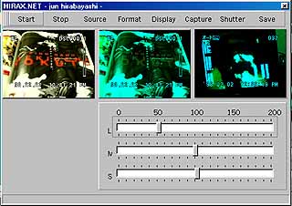 ではインターネット上にある画像ファイルに対して、画像処理をかける「色覚モドキソフト」を作ってみた。コンピュータにネットワーク上のものが見える「色覚」を持たせて、ネットワーク上の画像について考えてみたわけだ。そして、ではそれを自分のPCの中にある画像ファイルをいじるようにしてみた。つまり、コンピュータに自分の中のものが見える「色覚」を持たせて、自分の中を覗いてみたのである。そして、今回はPCに接続されているビデオカメラを用いて、コンピュータに現実社会を眺める「色覚」を持たせてみることにしたのである。そんな現実社会を眺めることができて個性を持つコンピュータを通して、現実社会を眺めてみたいと思うわけだ。