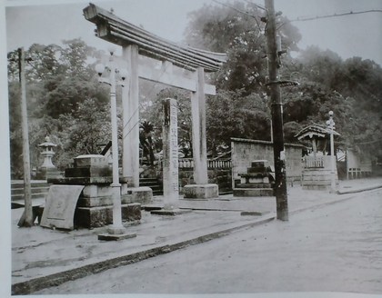 さて、下に張り付けた画像が明治末期の三島大社前です。三島大社の大鳥居前を走るのが東海道です。右の方の先には、お江戸日本橋があって、左の方へ歩いて行くと伊勢神宮や京都があります。この写真なら、同じ場所にタイムトリップしやすそう、というわけでこの場所へ行って写真を撮ってみることにしました。