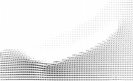 B : 「左端の空気の速度はもちろんさっきと同じだが、指の後ろでは空気が渦巻いているし、右端の空気の速度は全然違うな。」A : 「もっとリアルに、窓の外に手を出したときの、指の周りの空気の動きを時間を追って計算してみた計算結果のアニメーションが次の図だ。指の周りに空気が渦巻いていく様子がよくわかるハズだ。」