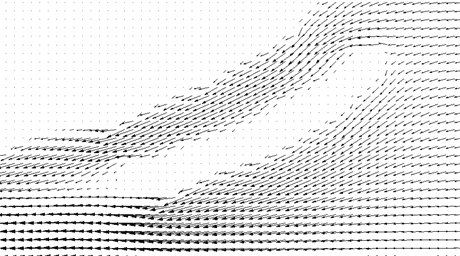 ![]() | 窓の外に手を出したときの、指の周りの空気の動きを時間を追って計算してみたもの。指の周りに空気が渦巻いていく様子がよくわかる。 メッシュを細かく切ったおかげで、計算結果は1GB弱。なんてこったい。 |