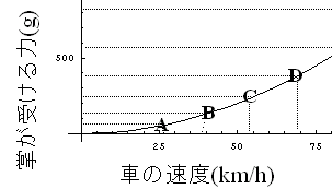 という条件下で計算を行うと、粘性抵抗よりも慣性抵抗の方がはるかに大きく、掌の受ける力はほとんど慣性抵抗である。試しに、これらの数値を使って窓から出した(単純な)掌が受ける力を計算してみたのが次のグラフである。このグラフを見れば、窓から出した掌が受ける力が車の速度の二乗に比例していることが判ると思う。なお、ここで掌が受ける力の単位は(g重)に換算したものである。オッパイ星人の力学を考えるときの単位はkgでなくて、gの方が使いやすいのである。