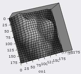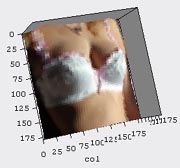 その「巨乳ビジョン」の効果をまずは例をとりながら説明してみたい。まずは、以前「もう一つの目から眺めた世界/a>vでは、hirax.net式「平面画像立体化法」を使って、平面画像を立体化してみた。その立体画像から、奥行き情報を知ることができるだろうか? 何より最初に、平行法でこの二つの図形を眺めてみよう。青い四角が視点に近くせり上がってきて、緑の円はほんの少しだけ背景から浮かび上がっているのが見えるだろうか? それでは、この二つの画像を巨乳ビジョンを使って解析してみよう。ステレオマッチングにより画像の奥行き・高さ情報を計算するソフトウェアは色々とあるが、ZitnickkKanade氏らによるCooperative Stereo VisionアルゴリズムによるZK Stereoというアプリケーションもその一つである。わが「巨乳ビジョン」では、このZKStereoを使って上の二枚の画像から奥行き情報を計算している。その計算結果が例えば次のグラフである。このグラフ中では視点に近いほど高く描かれ(色は濃く)、視点から遠いほど低く(色は薄く)描かれている。 このグラフを眺めてみれば、青い四角が背景よりずいぶんとせり上がっていて、私たちの視点にとても近いようすがよく判ると思う。また、緑の円も若干だけ背景から浮かび上がっているようすも明瞭にはっきりと浮かび上がっている。 というわけで、「巨乳ビジョン」は平面画像から奥行き情報を再構成できることを確認した上で、問題のバスト画像で確認してみたい。サンプル画像として、"3DFeminine Photo Gallery"というページ中にあった画像を縮小したものを用い、先程と同じようにCooperativeStereo Visionアルゴリズムによりにより、奥行き情報を再構成してみたものが次のグラフになる。 見事に「二つの胸のふくらみ」(C.魔女っ子メグちゃん)が浮かび上がるのだ。思わず、シャランラシャランラヘイヘヘイと歌いたくなるほどである。このように、二枚の角度が異なる画像さえあれば、この「巨乳ビジョンは」バストの大きさが判るのである。 しかも、このバストの高さグラフにオリジナルの写真をマッピングしてみたりなんかすると、もう大変である。リアリティ満点で色んな角度からグリグリ眺めたりすることすらできるのである。カップのサイズも寄せて上げているようすもぜ〜んぶ知ることができるのである。 …し・しかし、である。これはあまりに強力すぎるのである。あまりにこの「巨乳ビジョン」はスゴすぎてシャレにならないのだ。この「巨乳ビジョン」が量産された日には、邪な心を持つヤカラによって悪用されかねないし、善良な心を持つものであっても、全てオッパイ星人扱いされかねないのである。 例えば、こんな風に巨乳ビジョンを装着した地球人でさえ、何かちょっとスケベなオッパイ星人にしか思えなかったりするに違いないのだ。恐るべし、巨乳ビジョンなのである。と・とはいえ、やはりこれでは正義の味方の武器としては使いものにはならない。これでは、絶対に悪用されて正義の武器どころか悪の象徴となってしまうかもしれないのだ…。 ワタシと同じく、専守防衛仲間だったハズの自衛隊のイージス艦の名前の由来は、ギリシャ神話の最高神ゼウスの娘が持つ「全ての邪悪を払う盾」イージスである。そのイージスの盾には、見るもの全てを石に変えるメデューサの首がはめ込まれている。 というわけで、ワタシはこのあまりに危険な最終兵器「巨乳ビジョン」を封印することにし、武器を捨てて街へ出て、改めてワタシの素手で「オッパイ星人に狙われそうな可哀相な子羊(巨乳)」達を見つけだし救おうと誓ったのであった。