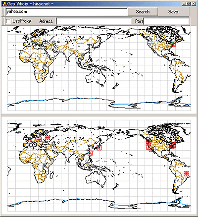 もちろん、いつものように数回だけの動作(不?)確認しかしてない完全無保証版である。 GeoWhois.exeの動作画面が次の図である。ドメインの場所を検索しその結果が上の方の画像に表示される。また、検索履歴が下の画像に表示される。検索履歴画像の方はSaveボタンでbmpファイルとして保存することができる。