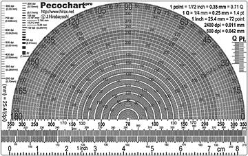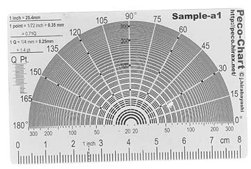 つまり、「このカタログはシアンは75°の角度方向に1インチ辺り175個のドットが並べられていて、マゼンダのドットは45°の角度方向に並べられている」、ということを、このPeco-Chartを重ねて置いてみさえすればたちどころに知ることができるのである。
