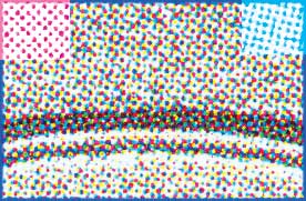 だから、毎朝届けられる新聞に折り込まれているチラシやカタログを眺めるときだって、そんなカタログに「ちっちゃなちっちゃな虫メガネ」を向けてみて、その「虫メガネ」を通して、カタログがどんな風に印刷されているかをよく眺めてみる。下の左のようなカラーの綺麗なカタログだって、「虫メガネ」を通して眺めてみると、右の拡大写真みたいに、四色(シアン、マゼンダ、イエロー、ブラック)が規則正しく並んでいるようすが見えてくるのである。離れてみればキレイな写真が「虫メガネ」を通して眺めてみるだけで、こんな風に様子が変わるなんてとても不思議な気分になったりするのである。まるで、女性の化粧のように不思議で、こんな四色の手品はとても面白いのである。