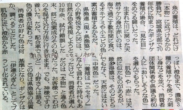 (中略)  (エサに入れた色素で養殖のサケの身の色を調整するために)消費者が好む色は何色か、調べることにした。…最多得票は、天然にはない「(肌色と赤の)中間色」だった。