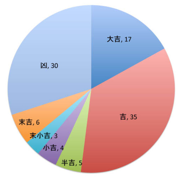 こうして眺めてみると、凶が多いなぁ…とか、半吉から末吉まではやたら細かく分かれているなとか、1/3超が吉だったのか…とか、色々考えさせられて面白いものです。