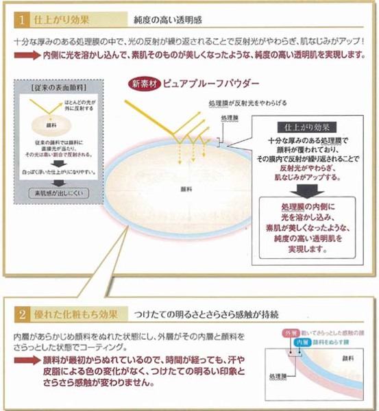 ファンデーションは、これまで両立が難しかった「カバー力」と「透明感」を実現し、肌そのものがグレードアップしたかのような印象に導く画期的な新商品。この、トラブルをカバーしながら、内側から輝くような透明感のある肌を実現するファンデーションの開発を可能にしたのが、顔料の表面を二重処理膜でコーティングした新規表面処理顔料「ピュアプルーフパウダー」。顔料の周りを二重処理膜でコーティングすることで、処理膜の内側に光を取り込み、反射光をやわらげて、内側からあふれ出るような光感を実現。まるで素肌そのものが美しくなったような透明感を演出する。