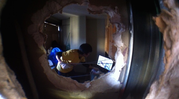 9Fでは、いしいこうた(ら)の展示では驚愕すると同時に爆笑し(この実世界コンピューティングの実装は最高で、一種の逆チューリング・テストじゃないか!とすら思わされました)、乙幡啓子さんの「妄想工作」に(そのセンスに)師と仰ぎたくなり、(何階だったか記憶が定かでないけれど)壁に投影されたスクリーンの中で、グラビアイドル?と楽しげにたわむれる半裸のオトコには何だか少し感動し、「3分間のインスタントなワタシの恋のビデオ」は画面の前を3分間離れる気になれず、ひたすら黒い雨が降り続ける教室ではちょっと考えさせられて…といった具合です。
