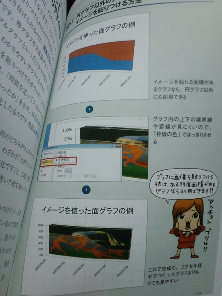 また、たとえば「図を張りこんだグラフ・特殊効果グラフ」なども、すべて「PowerPointだけで」作る手順を書いてみました。「使えるものはすべて使おう」という理想ではなく、「Windows上でMicrosoft Office(だけ)を主に使う人・場合が多い」という現実の中で、いかに「理想に近いものを(しかも簡易に)作るか」ということを考え、そういった手順書(図)を作りました。