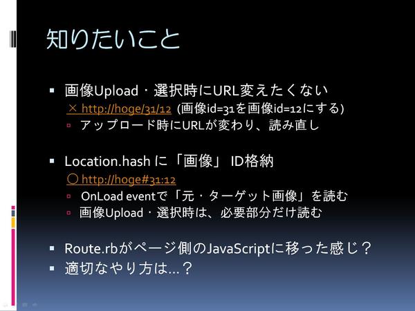 Railsで画像をUploadする時、画面遷移無しでアップロードを実現しようとすると、Iframeを利用することになる。そして、画面遷移無しでアップロードした画像に後でアクセスしたりしたい、と思い、Location.hashなどを使った。Rails側ではアンカーを取得できなかったので、JavaScriptでパーサーを書いた。つまり、Route.rbをJavaScriptが行うような実装になった。きっと、これはとてつもなく変で間違っているに違いない。